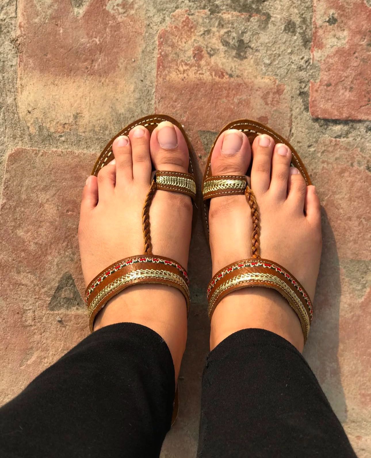Classic handmade leather kohlapuri with intricate zari tilla work.