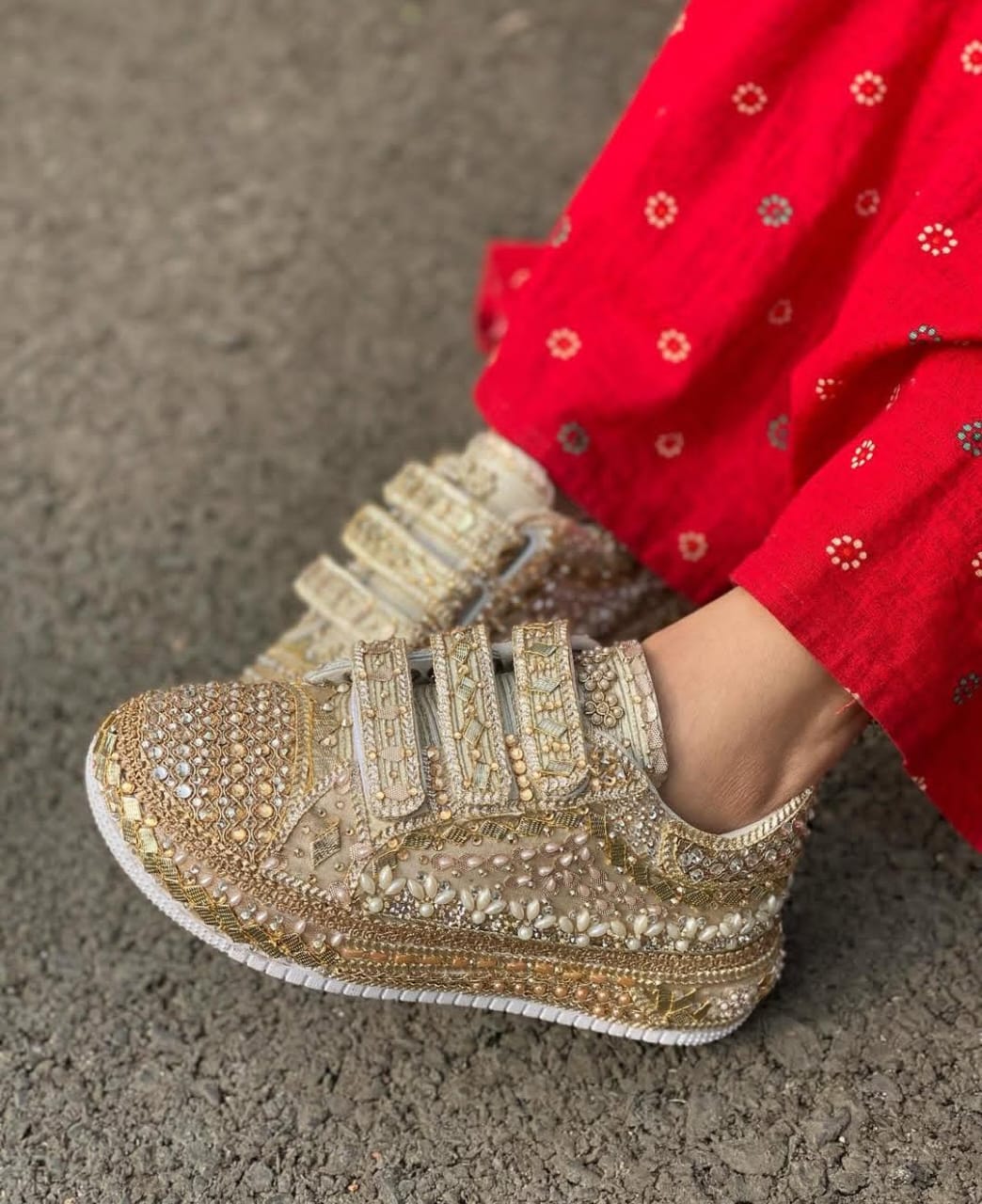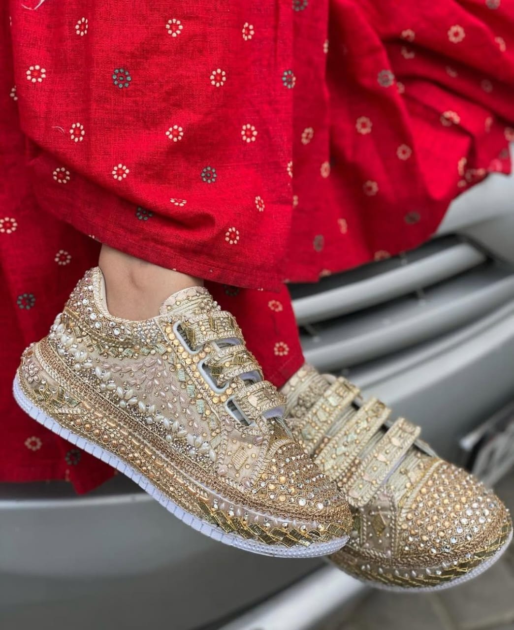 Add a touch of sparkle to your steps with these gold-beaded, handcrafted bridal sneakers, blending tradition and modern chic effortlessly.