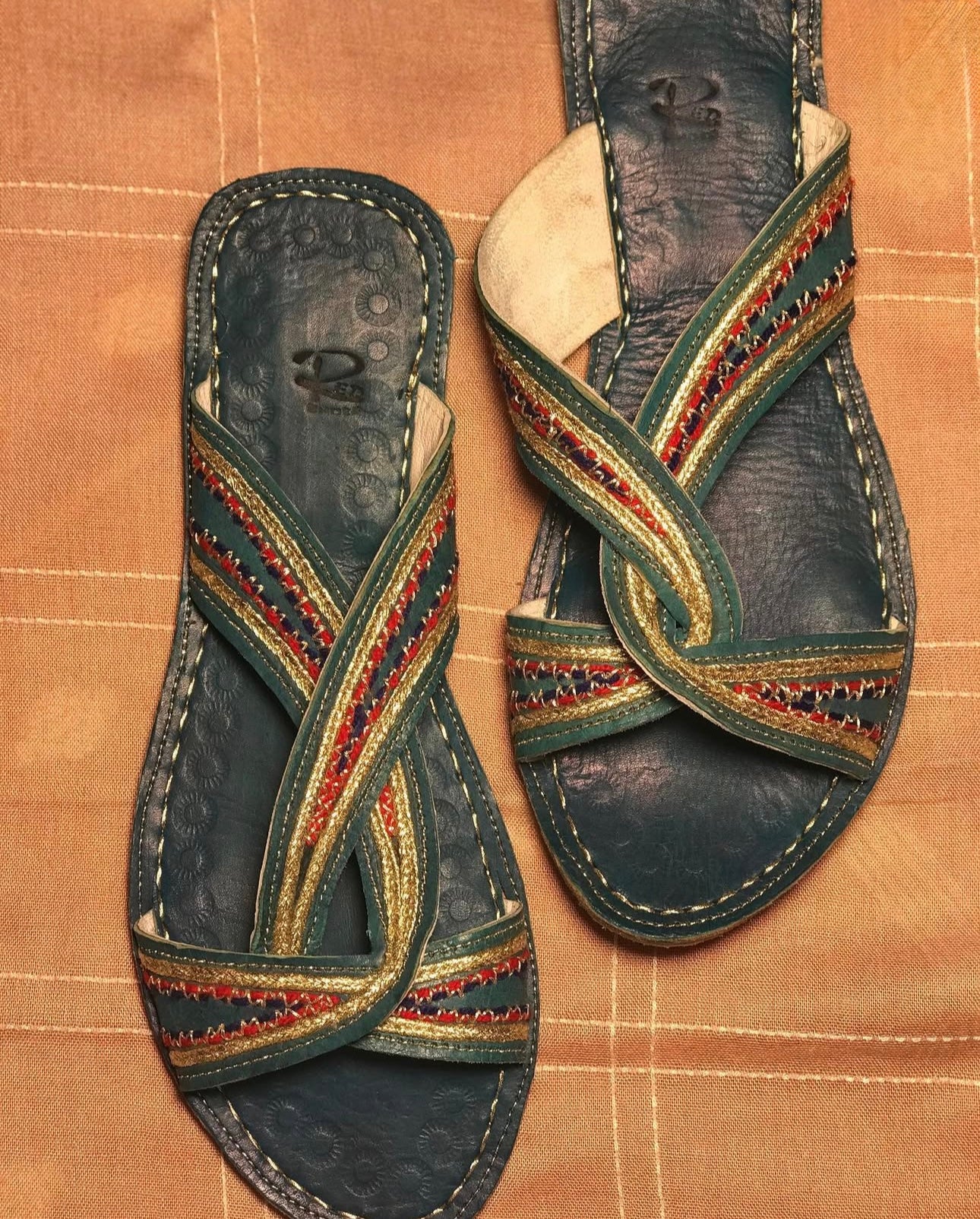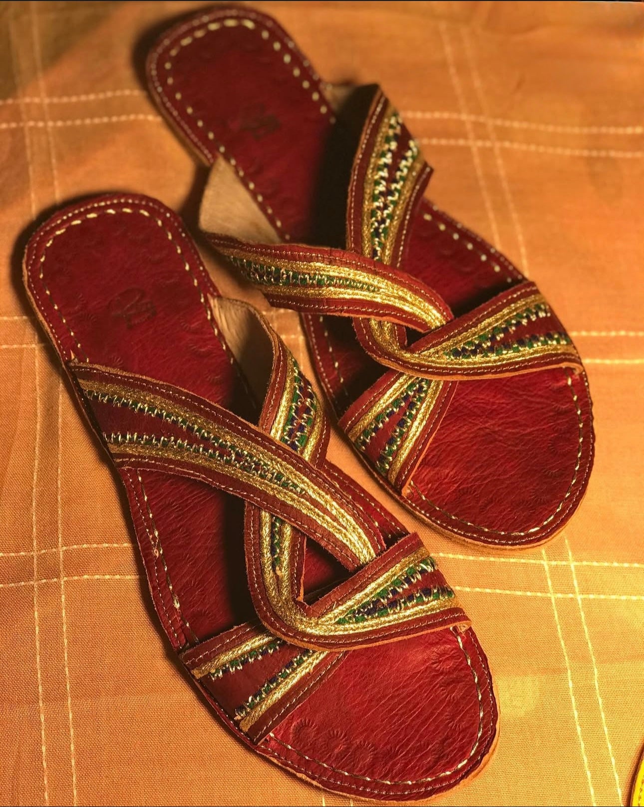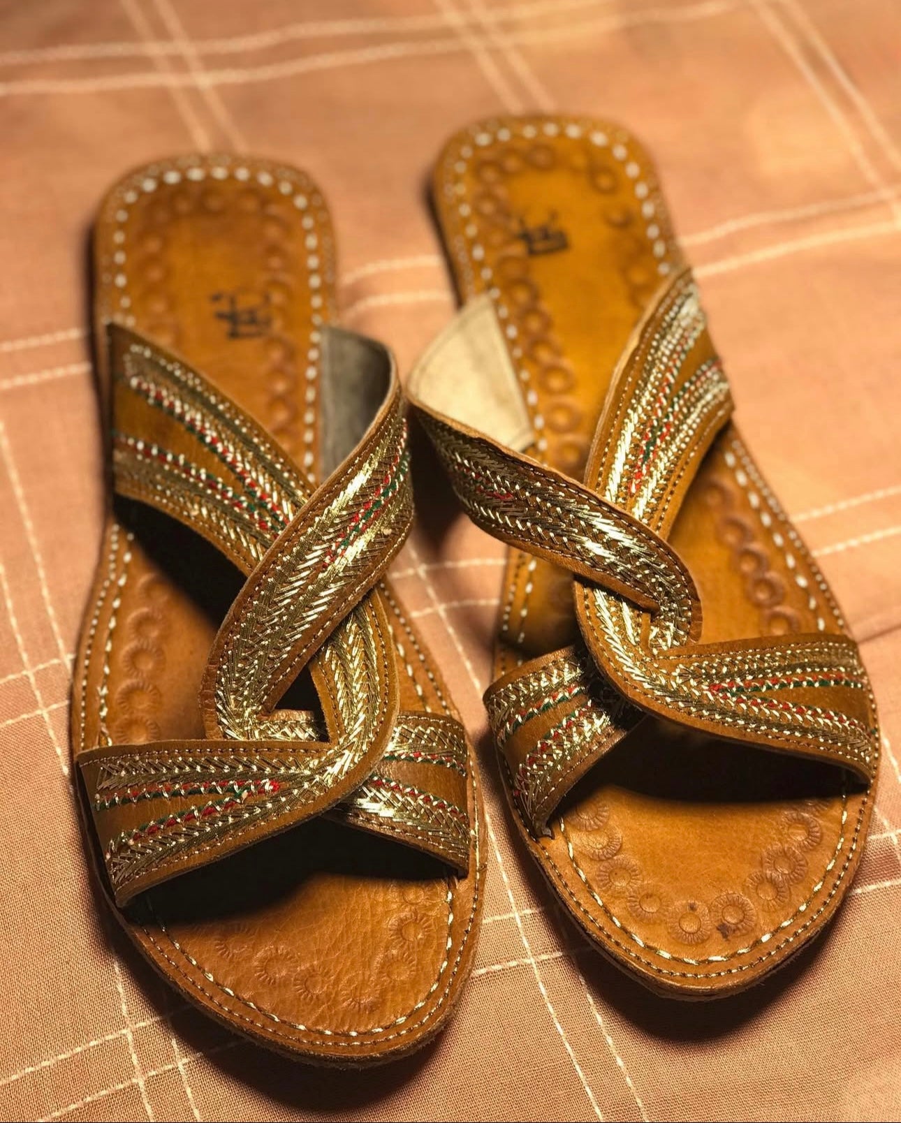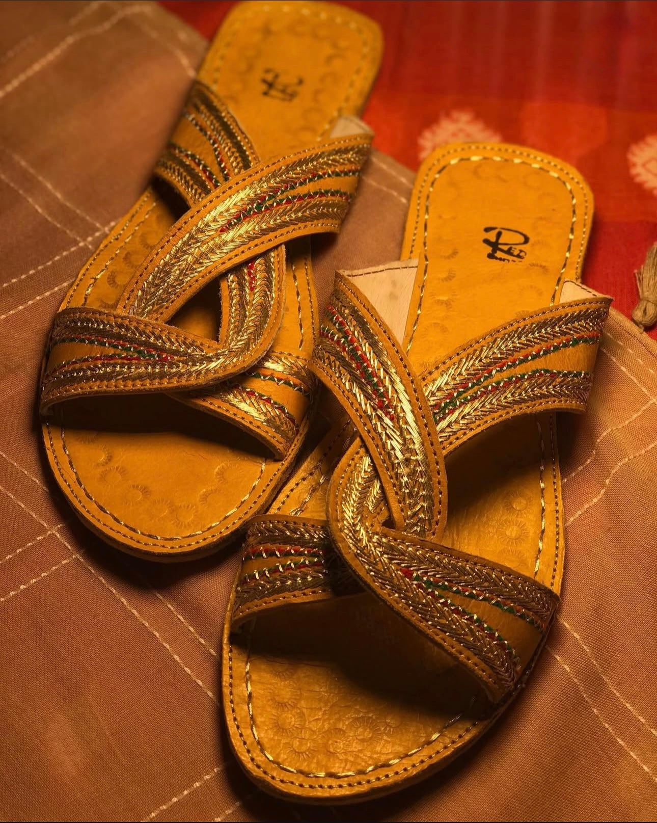 Handcrafted cross slippers in pure leather, detailed with zari — a touch of culture for every step✨